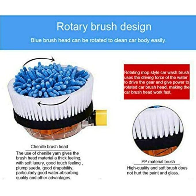 La brosse de lavage de voiture, qui est un dispositif rotatif de type éponge en microfibre, tourne et fournit du savon à votre voiture, et vous pouvez voir les engrenages tourner à l'arrière à partir de la pression de l'eau, ce qui est un design assez cool. Brosse de lavage de voiture, brosse de nettoyage avec poignée, équipement de lavage de voiture, brosse en mousse pour tuyau de jardin, brosse de nettoyage automobile